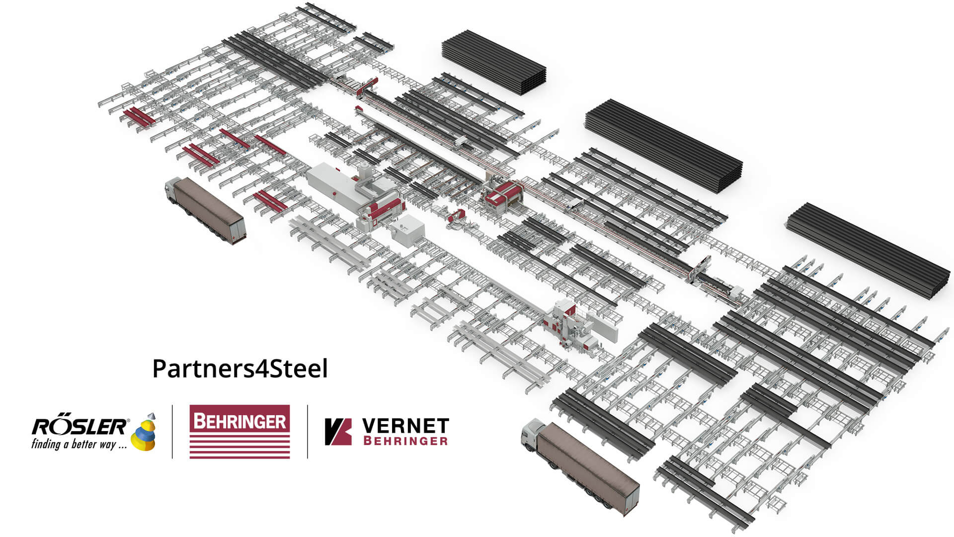 Partners4Steel (P4S) is the technology partnership between Behringer, Vernet Behringer and Rösler. Together, we supply customised, fully integrated production lines for profile steel processing - from sawing to drilling/milling/marking to blasting & preservation. This means you benefit from a chain of responsibility, optimized material flows and zero interface problems.
