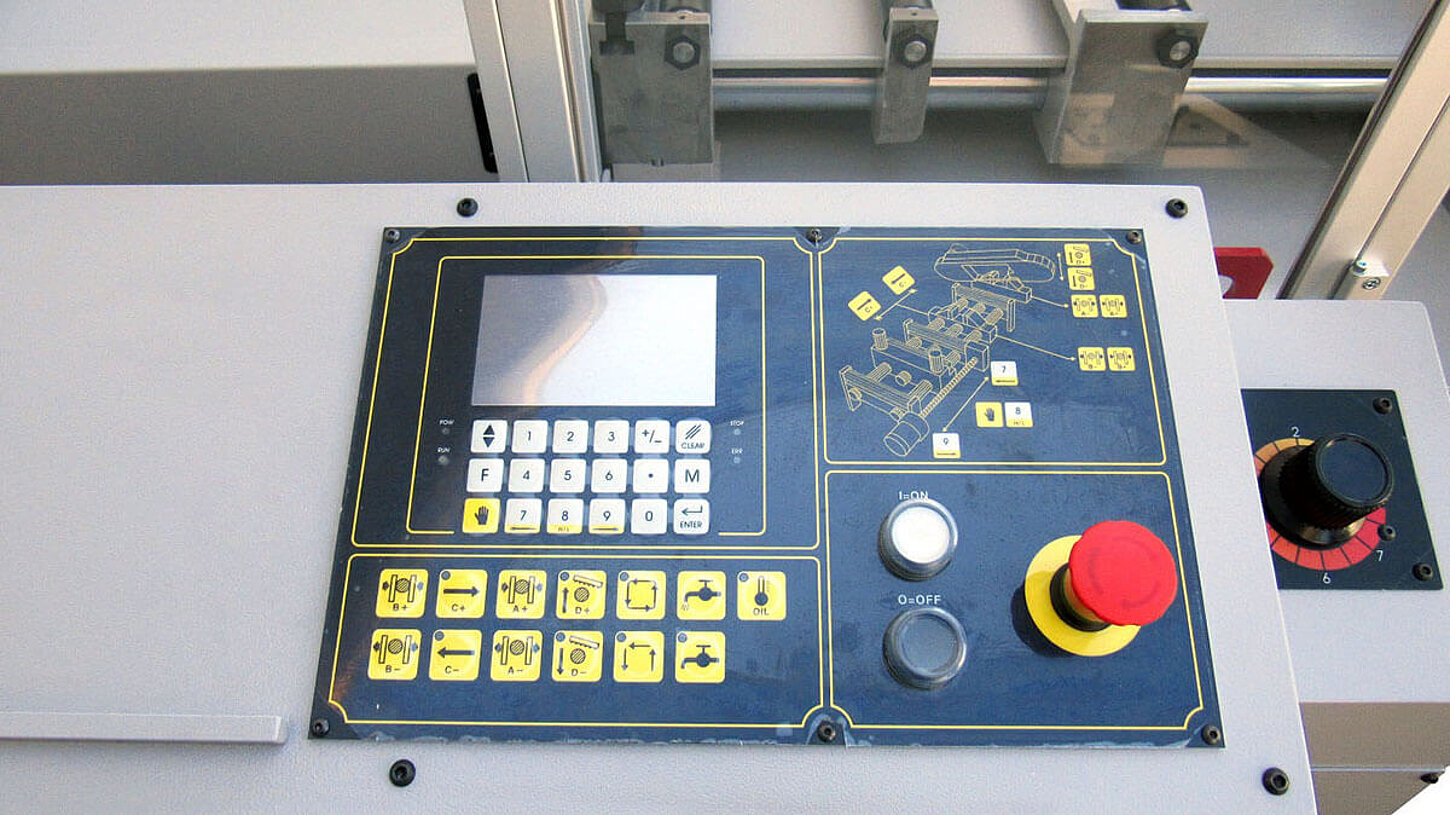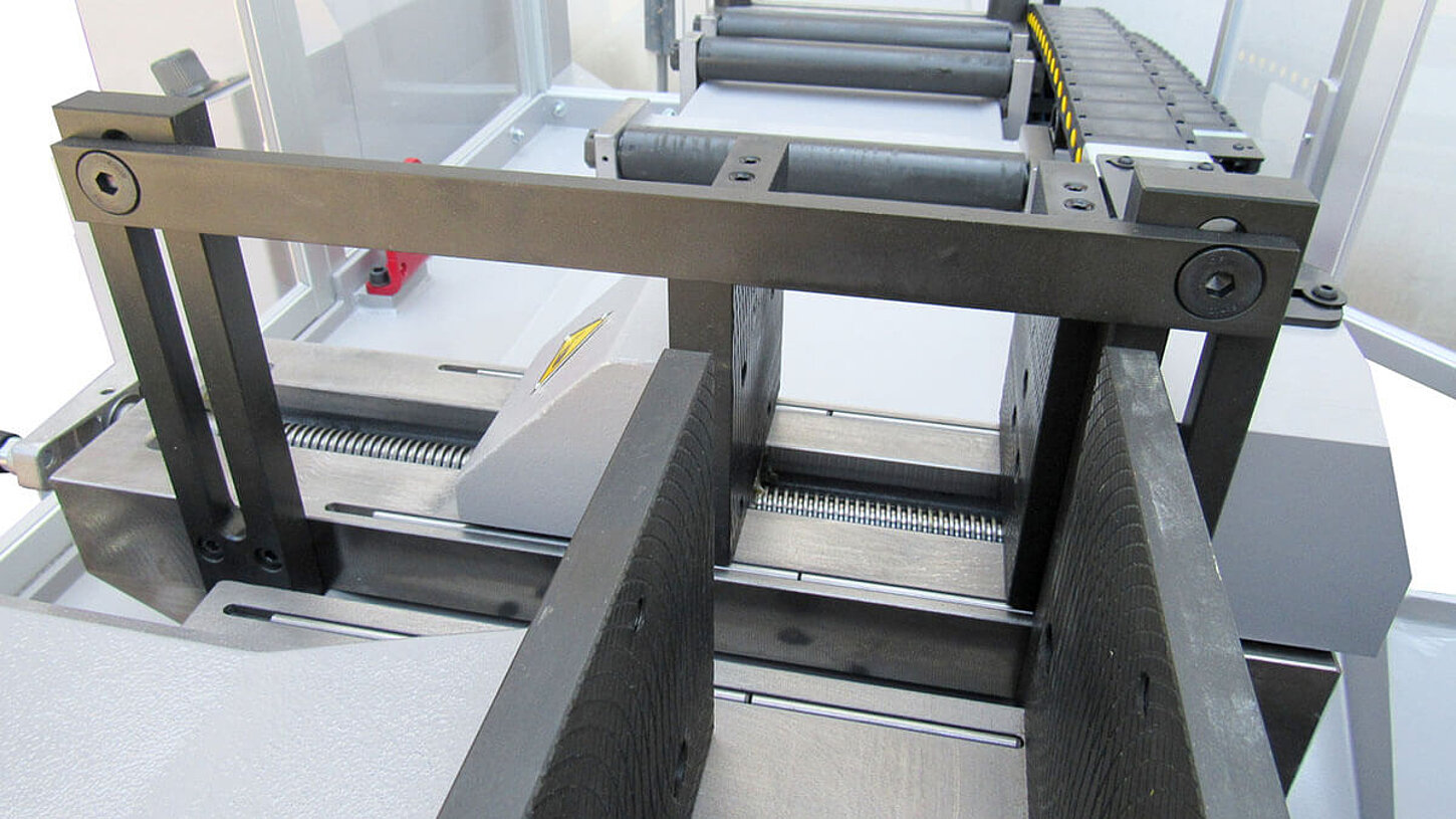 A hydraulically operated feeding gripper positions the material for series cuts. The cutting length is set using a stop that is positioned by an electrically driven spindle. Feed length and number of cuts can be programmed in the control. The automatic cycle is ended after the target number of cuts has been reached or when the material has ended.