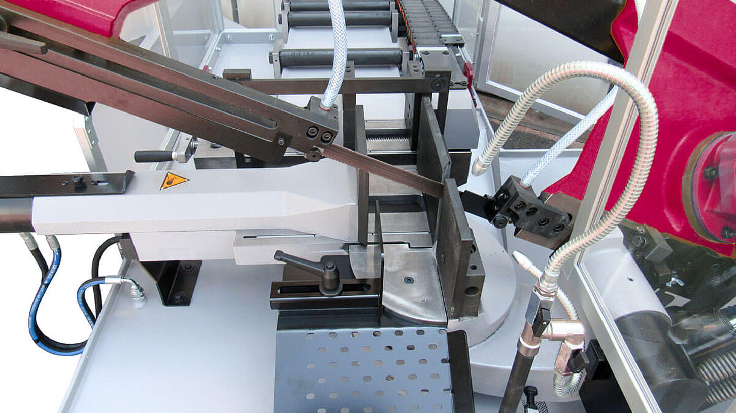 The saw band is tensioned manually. The setting of the correct tensioning force is displayed optically. In order to prevent overloading during the sawing process, the pressure is equalized by means of a pretensioned disc spring package. In the event of a band break, the sawing machine switches off automatically.