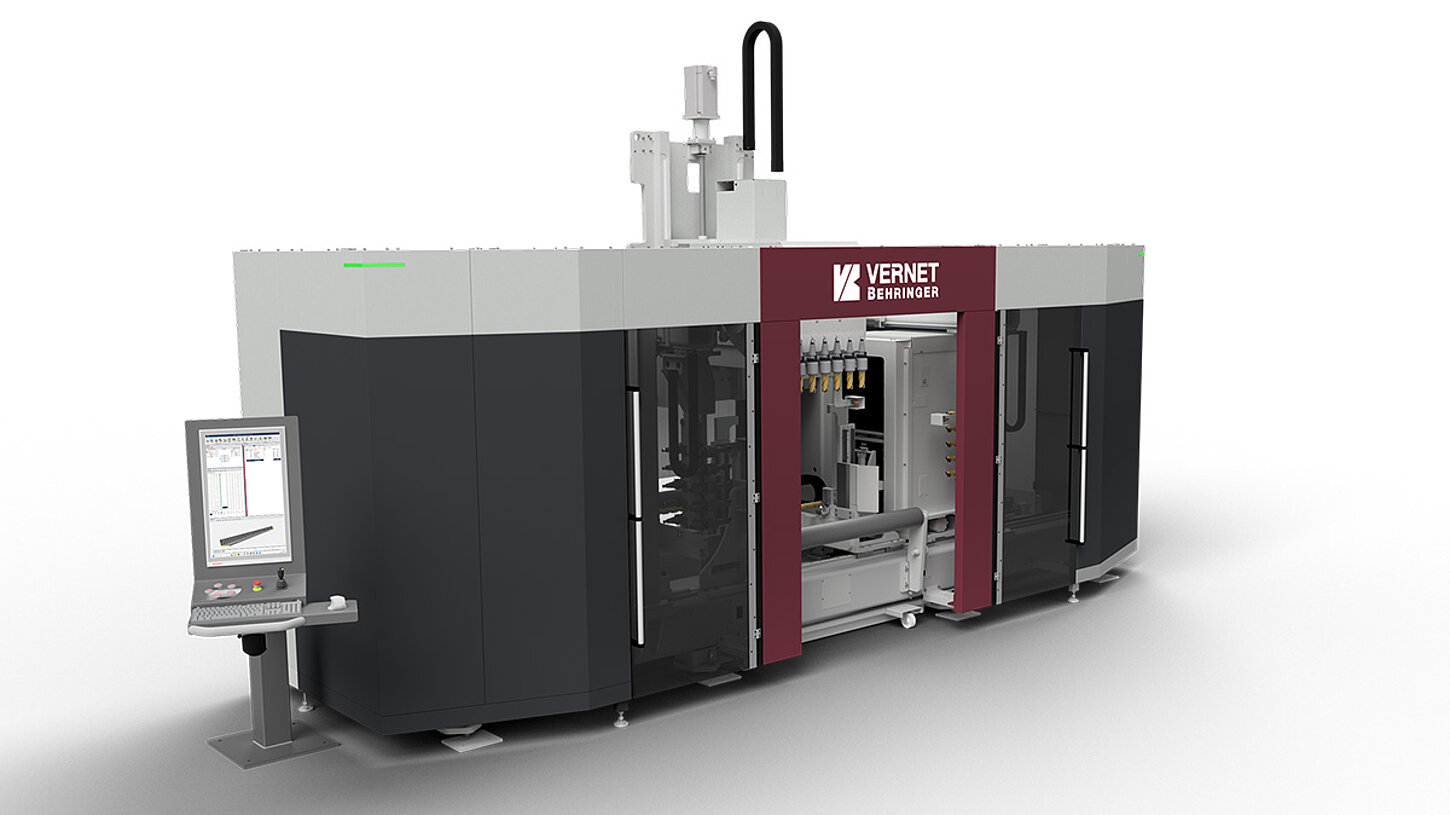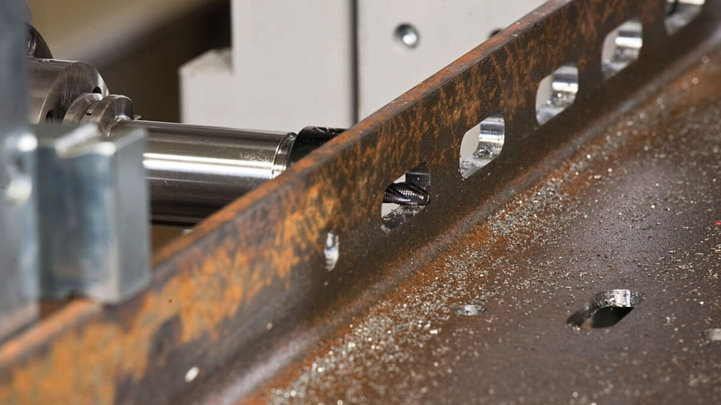 The HDX machining centre from Vernet Behringer is the fastest drilling, milling and marking machine on the market. Thanks to its 3 independent machining spindles, H, U and angle profiles as well as flat steel and rectangular tubes can be machined on 3 sides simultaneously. It is even possible to add one more milling spindle to process sections on 4 sides.